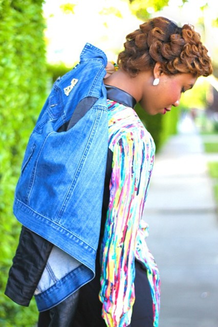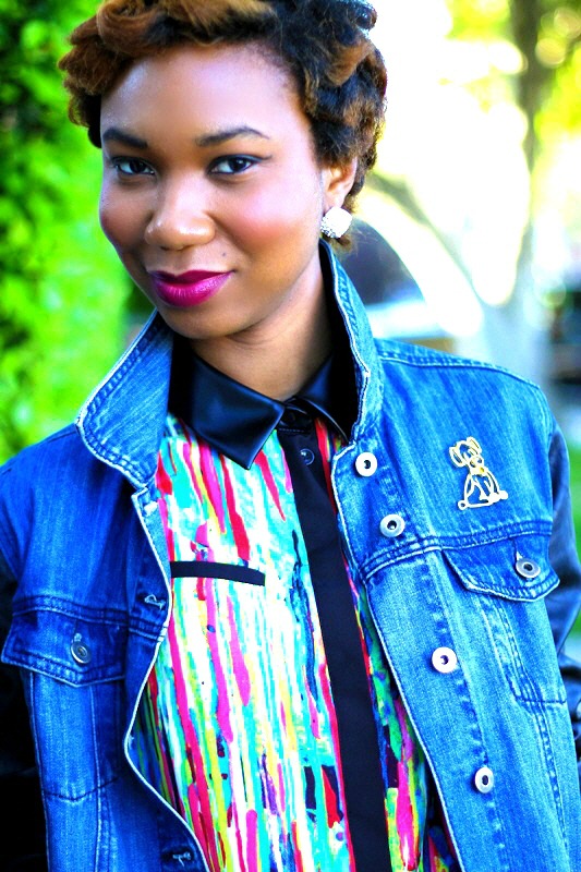 URBAN OUTFITTERS  denim/leather jacket, PRABAL GURUNG for TARGET tunic dress, ZARA platform heels, and I bought the doggy brooch at a flea market in London.