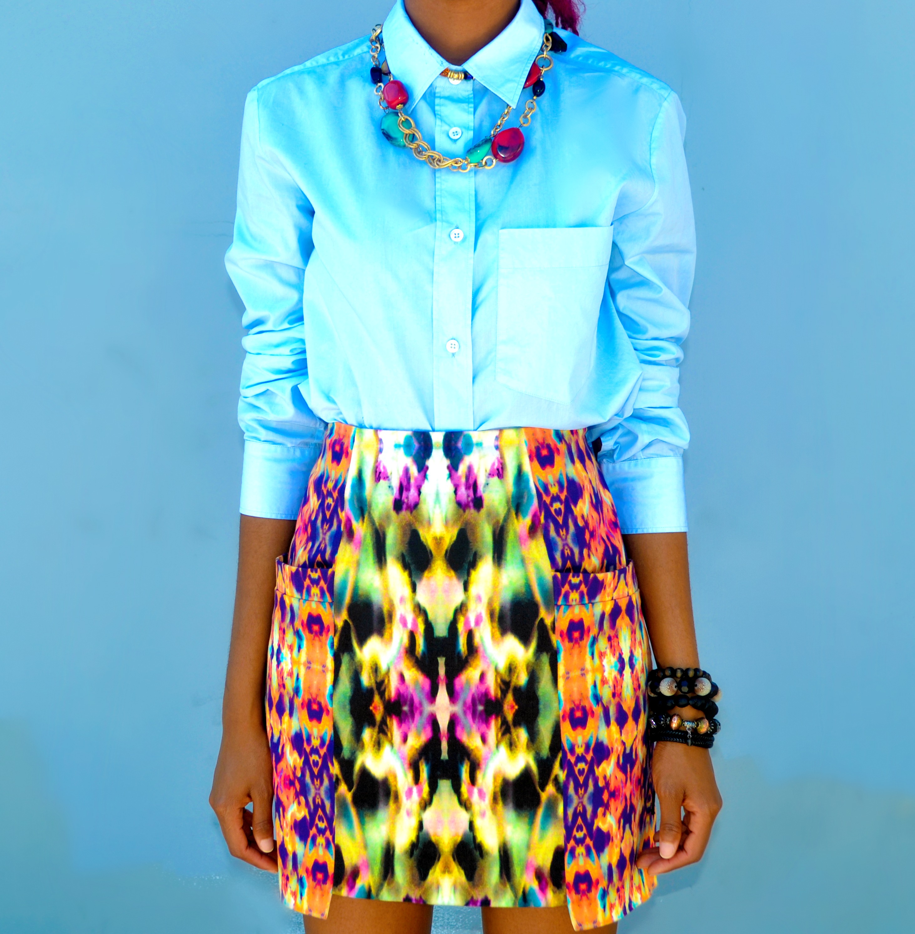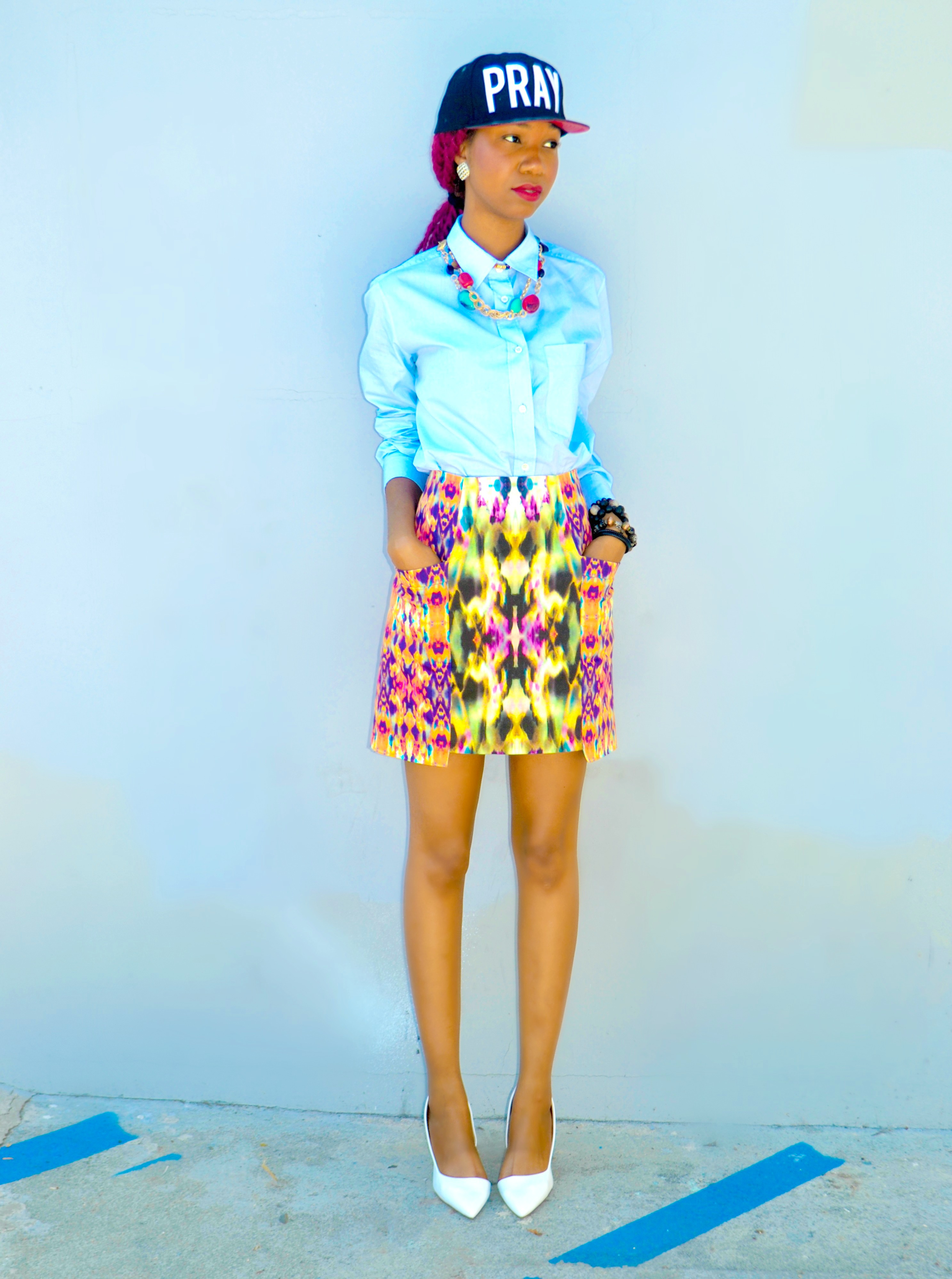 MAISON MARTIN MARGIELA shirt, ICB skirt, CALL IT SPRING white pumps, PRAY by KWAME ADJAYE buckle strap cap