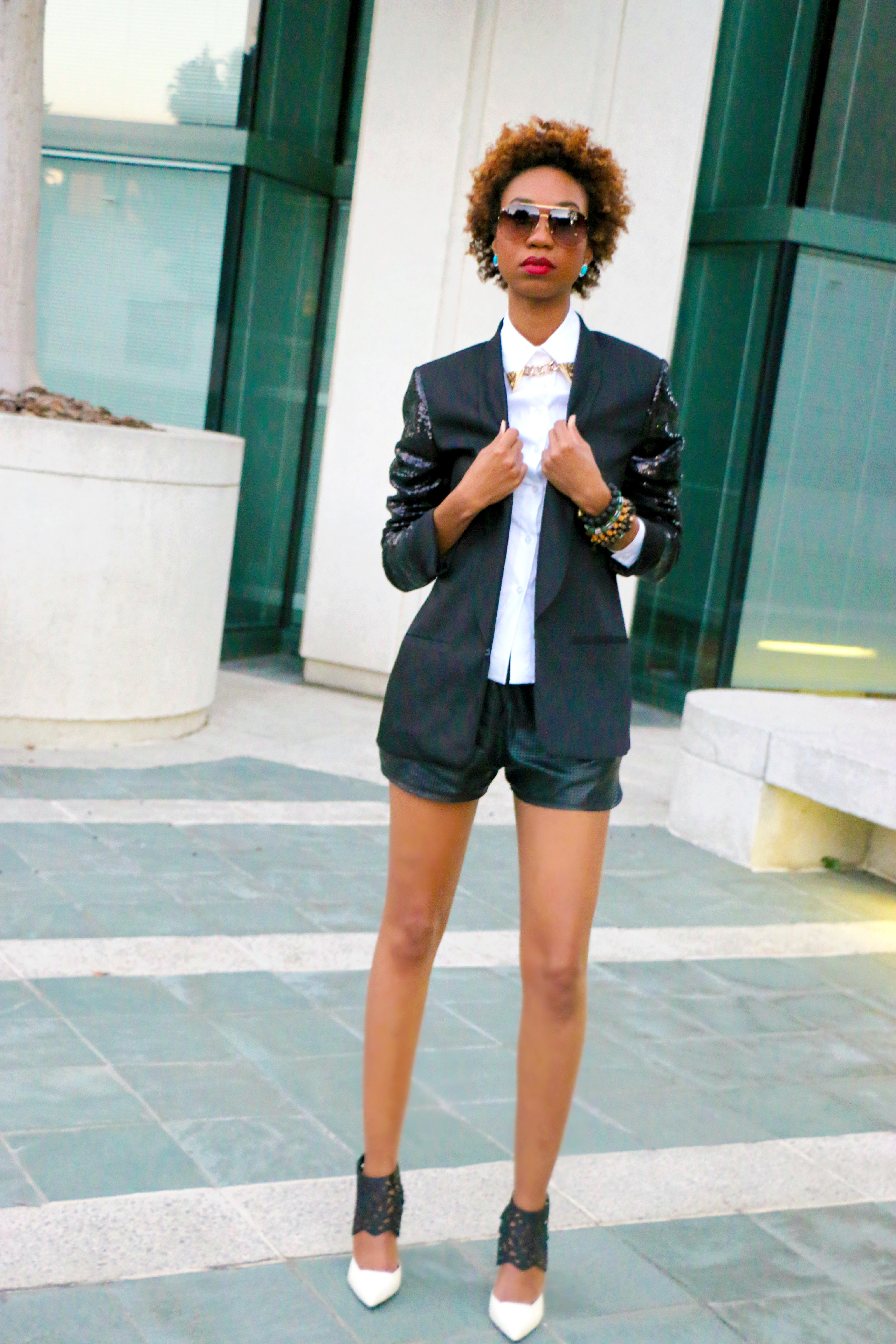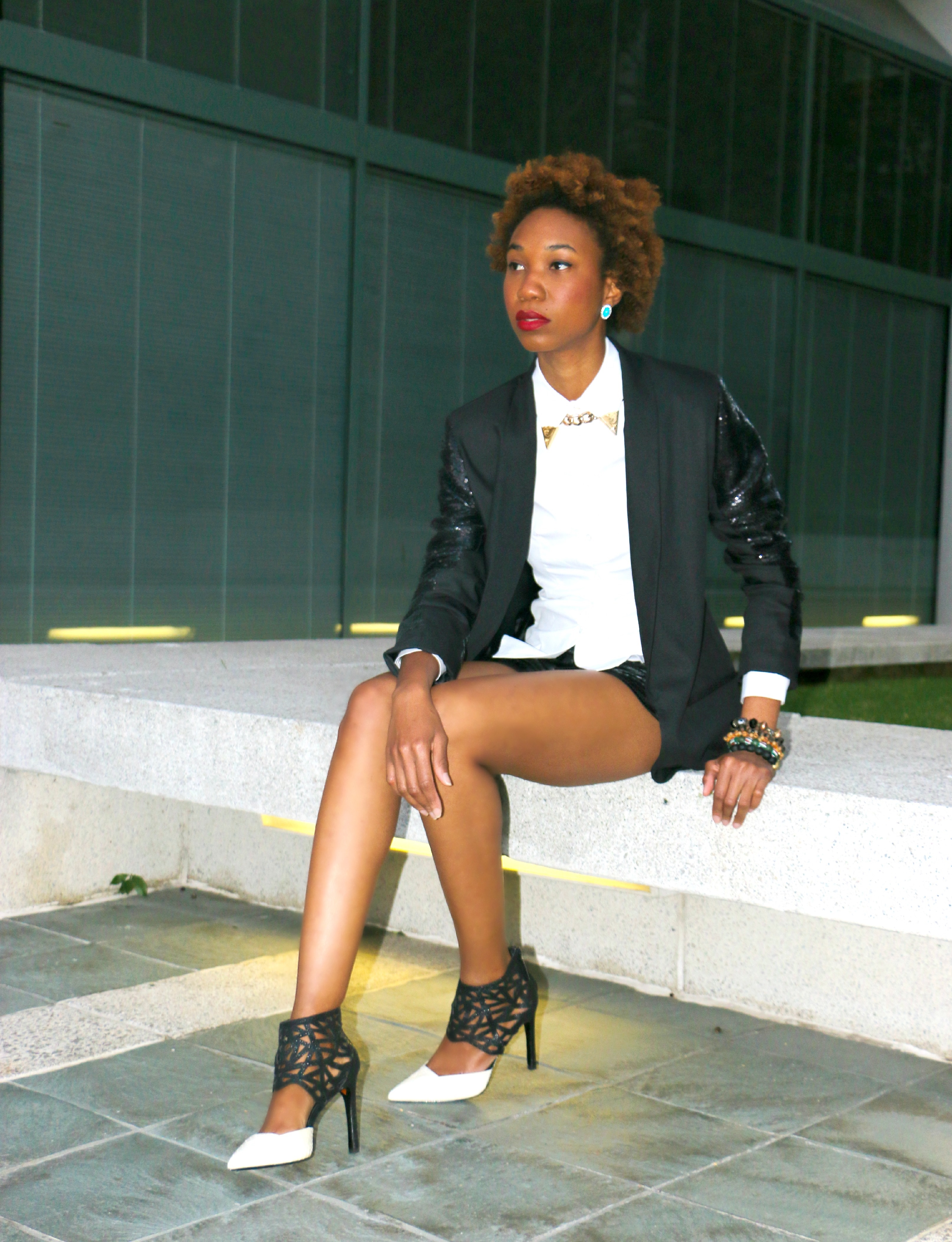 Guess who is back from her hiatus? That’s right! Forgive me for the disappearing act, but I can assure you that it was for a good reason. I have been working on some great things that will be coming to the site. Which brings me to today’s post.Ā  My sister came to visit, and IĀ  found this eye-catching blazer in her suitcase, so I decided to do a post in dedication to the holiday season. This look would be the ideal for your holiday festivities: dinners, parties, out dancing to name a few. It doesn’t always have to be about the sparkly dress, add character with a sequin detail blazer, and track inspired shorts for a sporty look.