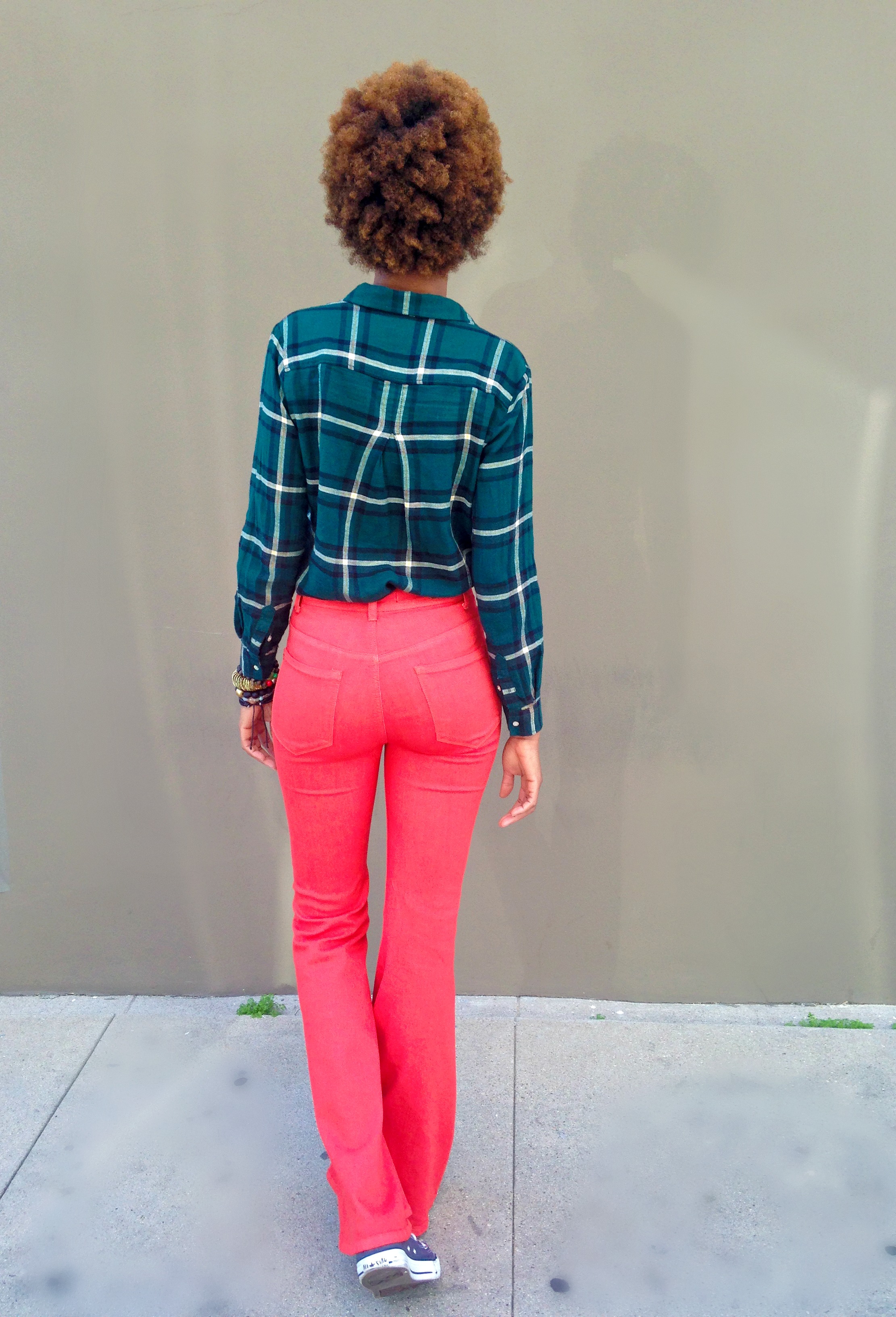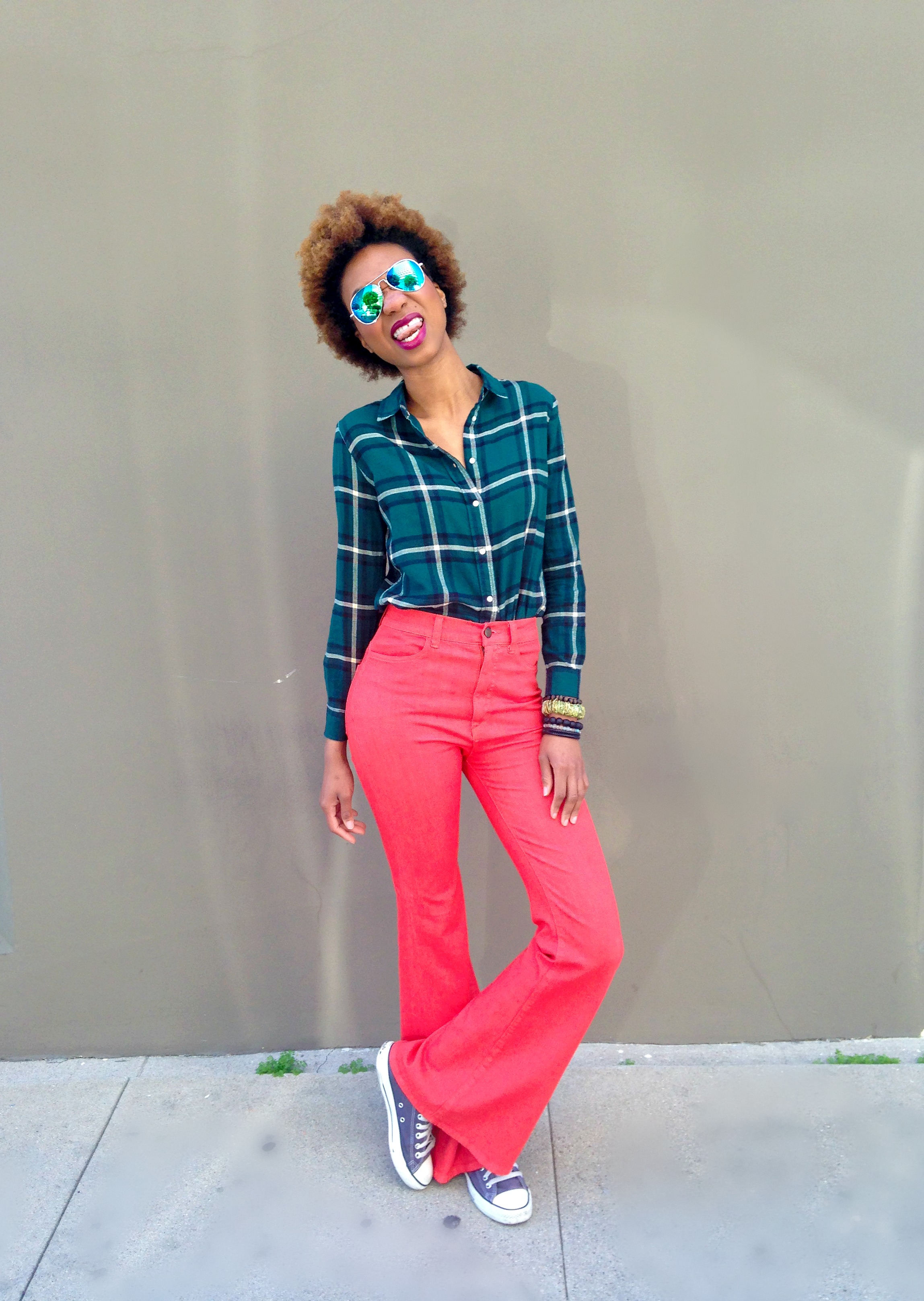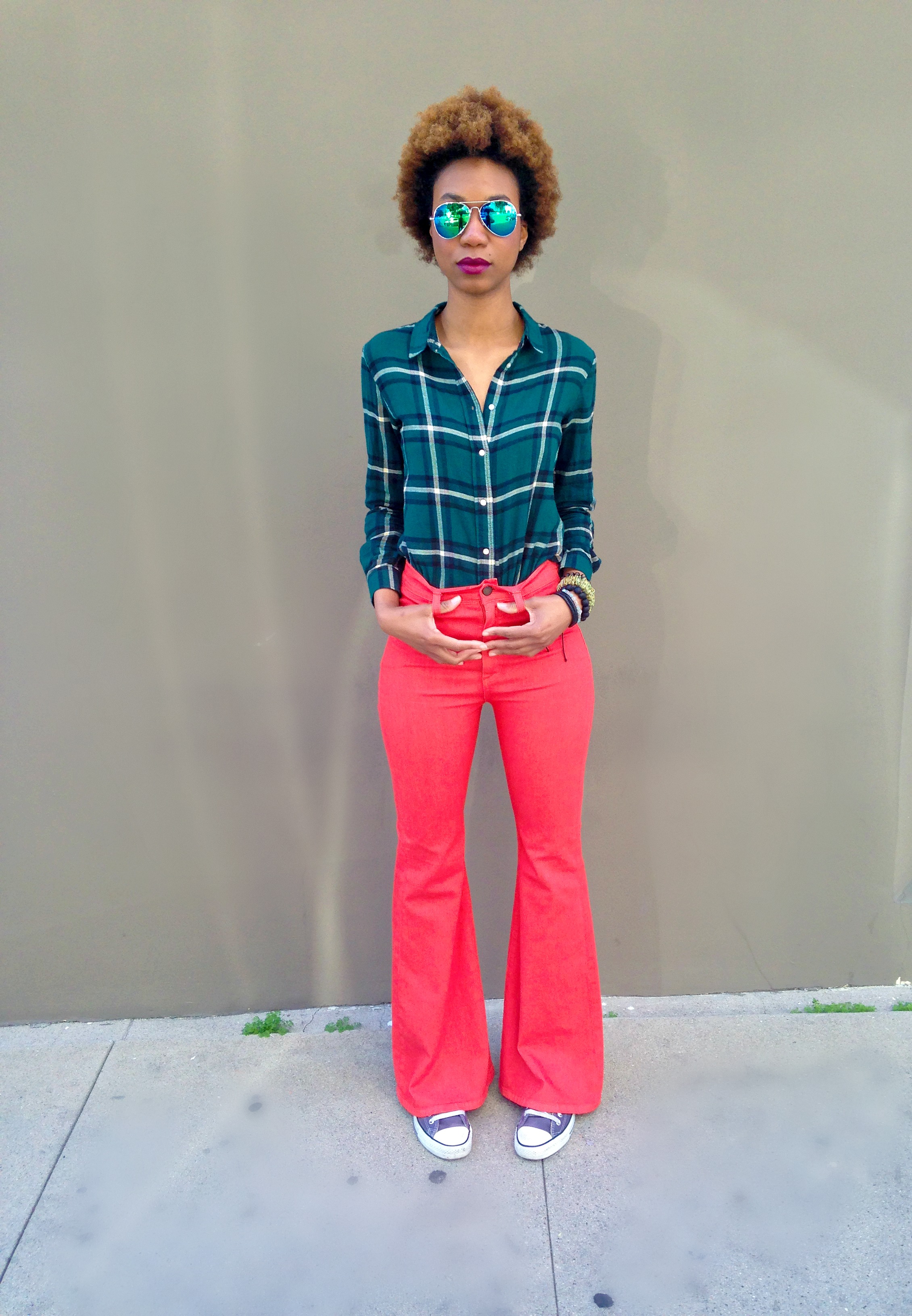 I’m dedicating this outfit to one of my favorite television sitcoms growing up: That 70s Show. I still remember the lyrics from the theme song, haha. I am such a lover of flare pants, especially this pair from urban outfitters. I have had it for over three years. Not only is it comfortable, and fits perfectly, but it has not stretched out even once! I paired them with a green plaid shirt, and rather than going the platform heel route, I opted for my trusty Chuck Taylor sneakers. Casual and groovy!