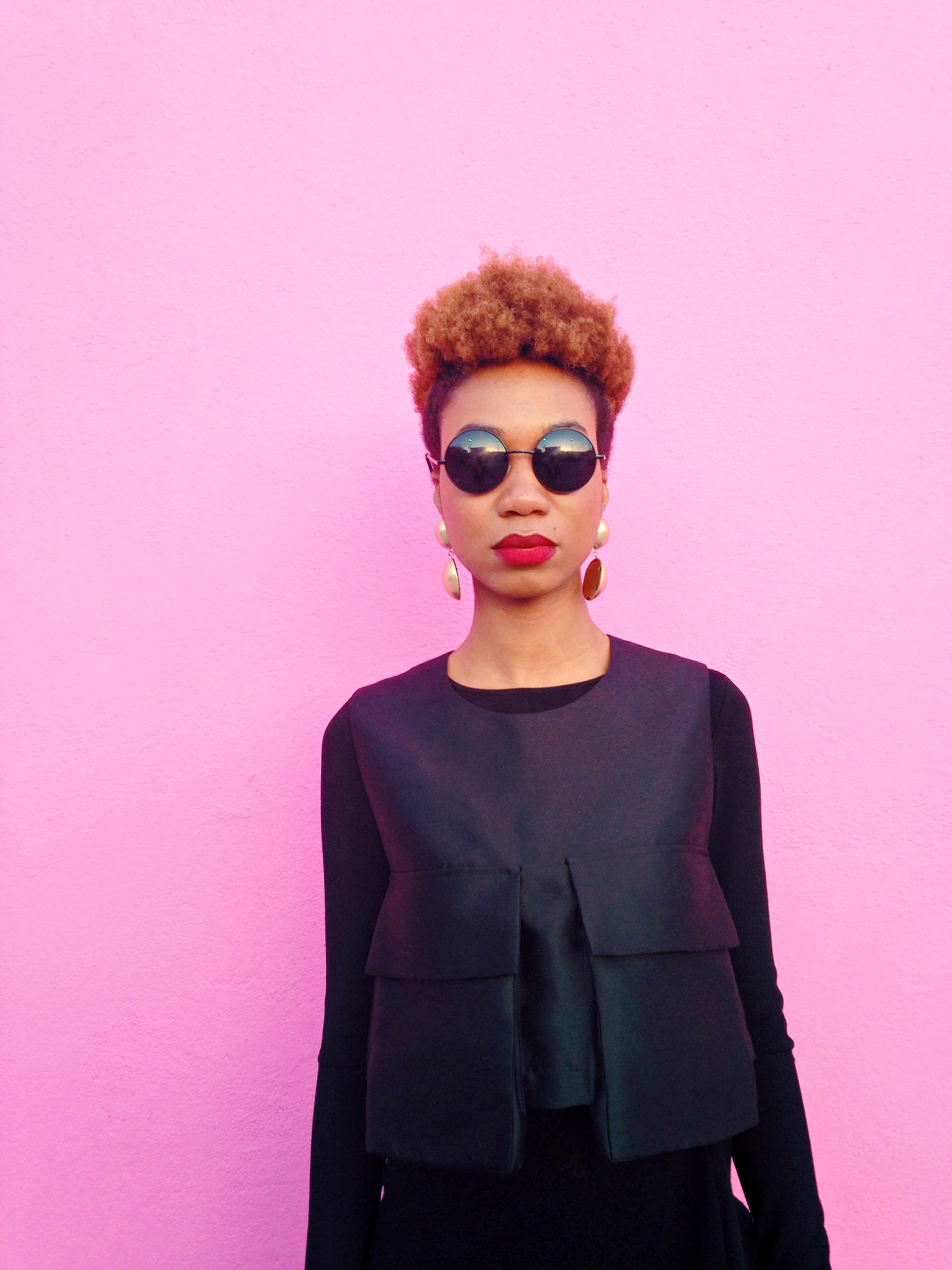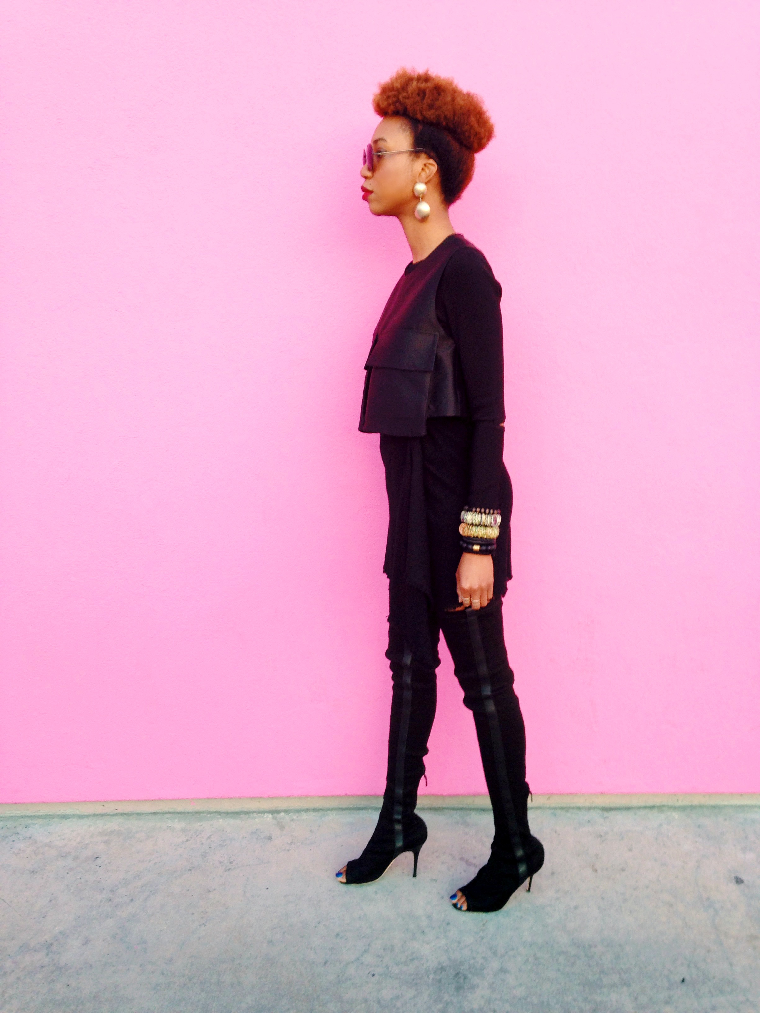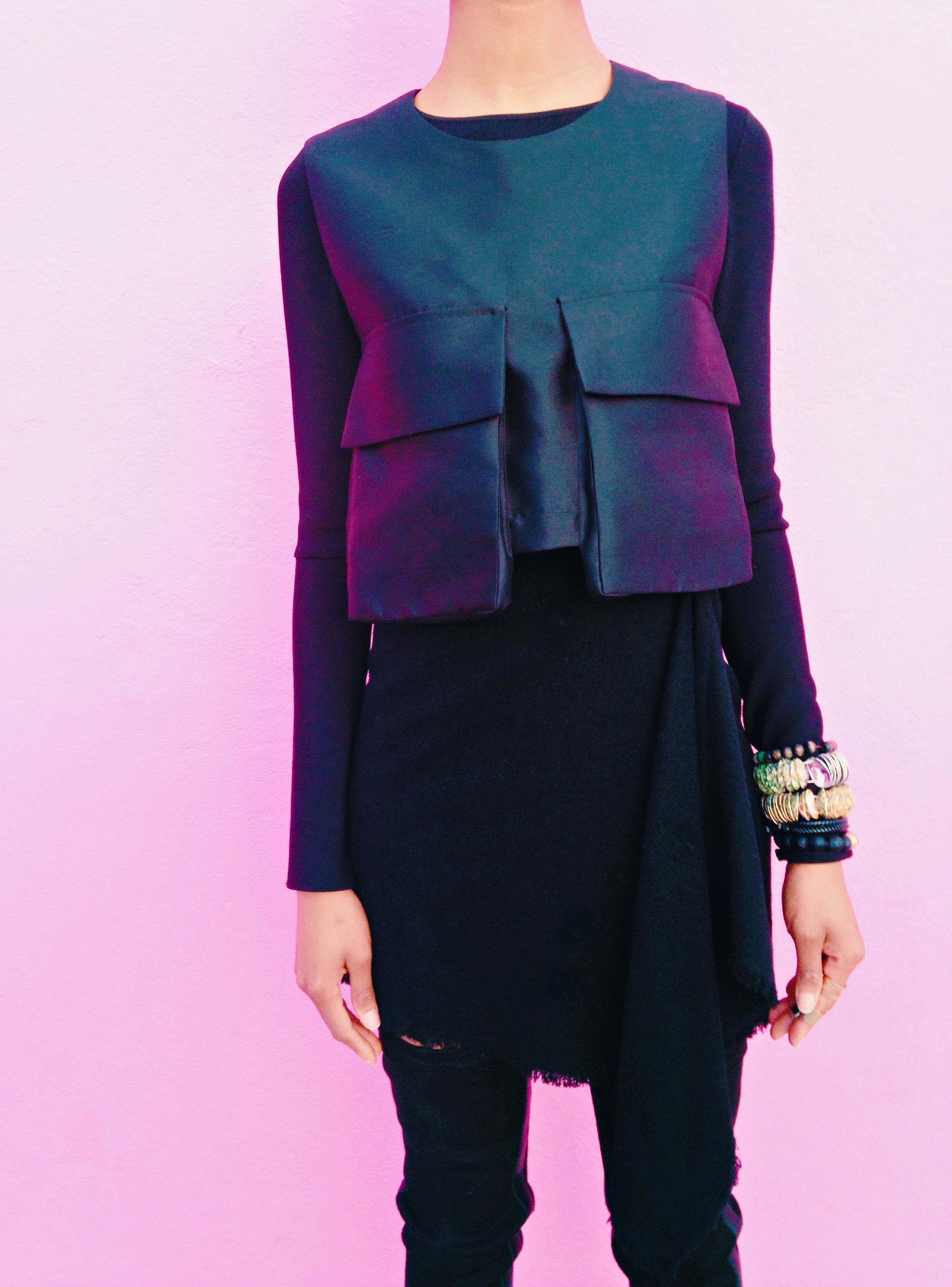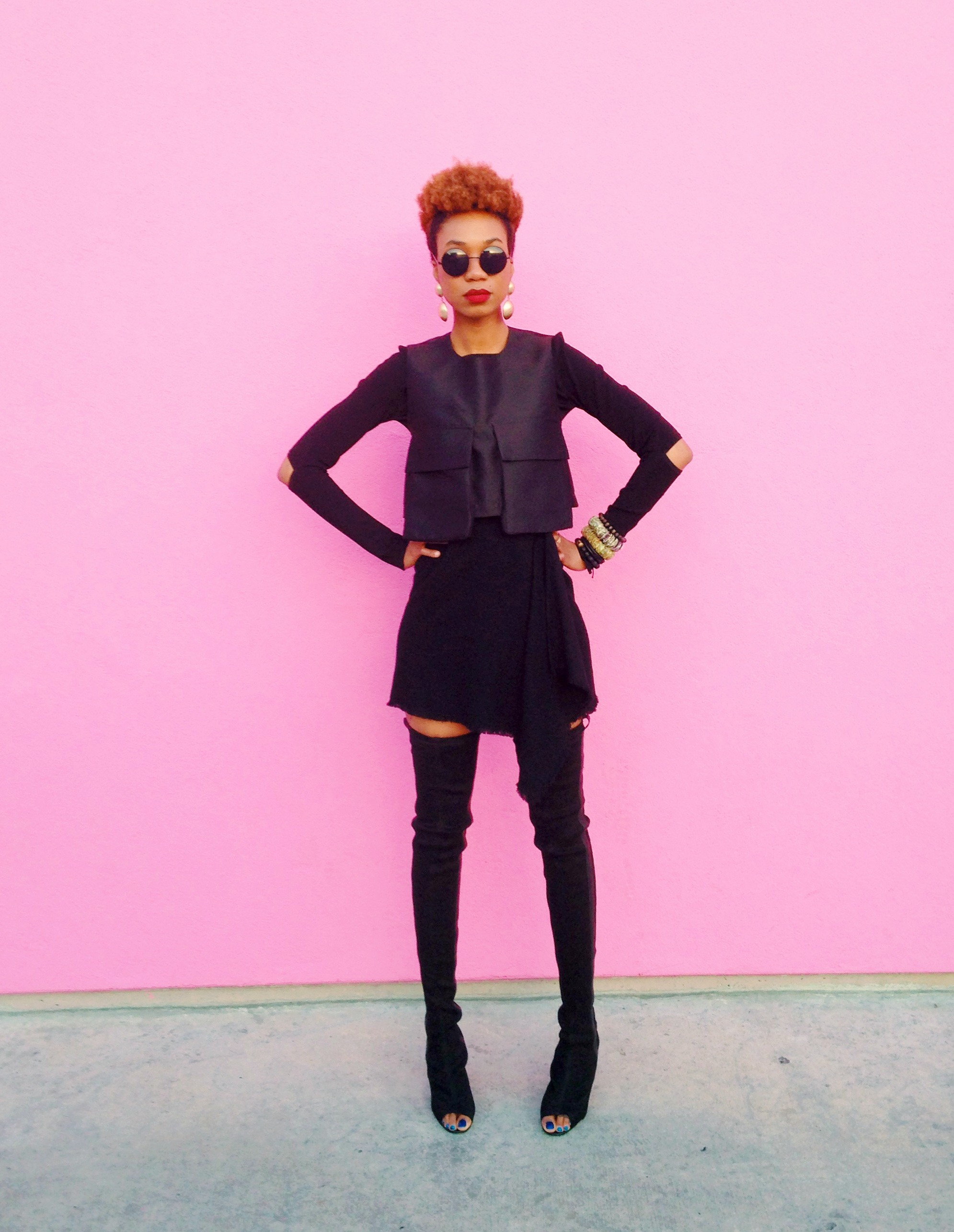 Now to my look. It may come across as a little black dress, but don’t be fooled, they are actually 3 separate pieces merged into one awesome outfit! Thanks to The Dreslyn sample sale, I didn’t have to break the bank for this amazing sleeveless cargo top, and cascade mini skirt. I was in the mood for something dark, edgy, and hardcore so I layered my look with a long sleeve crop top and a pair of sunglasses that look like they were borrowed from the character Morpeus from The Matrix movie. Did I nail it?