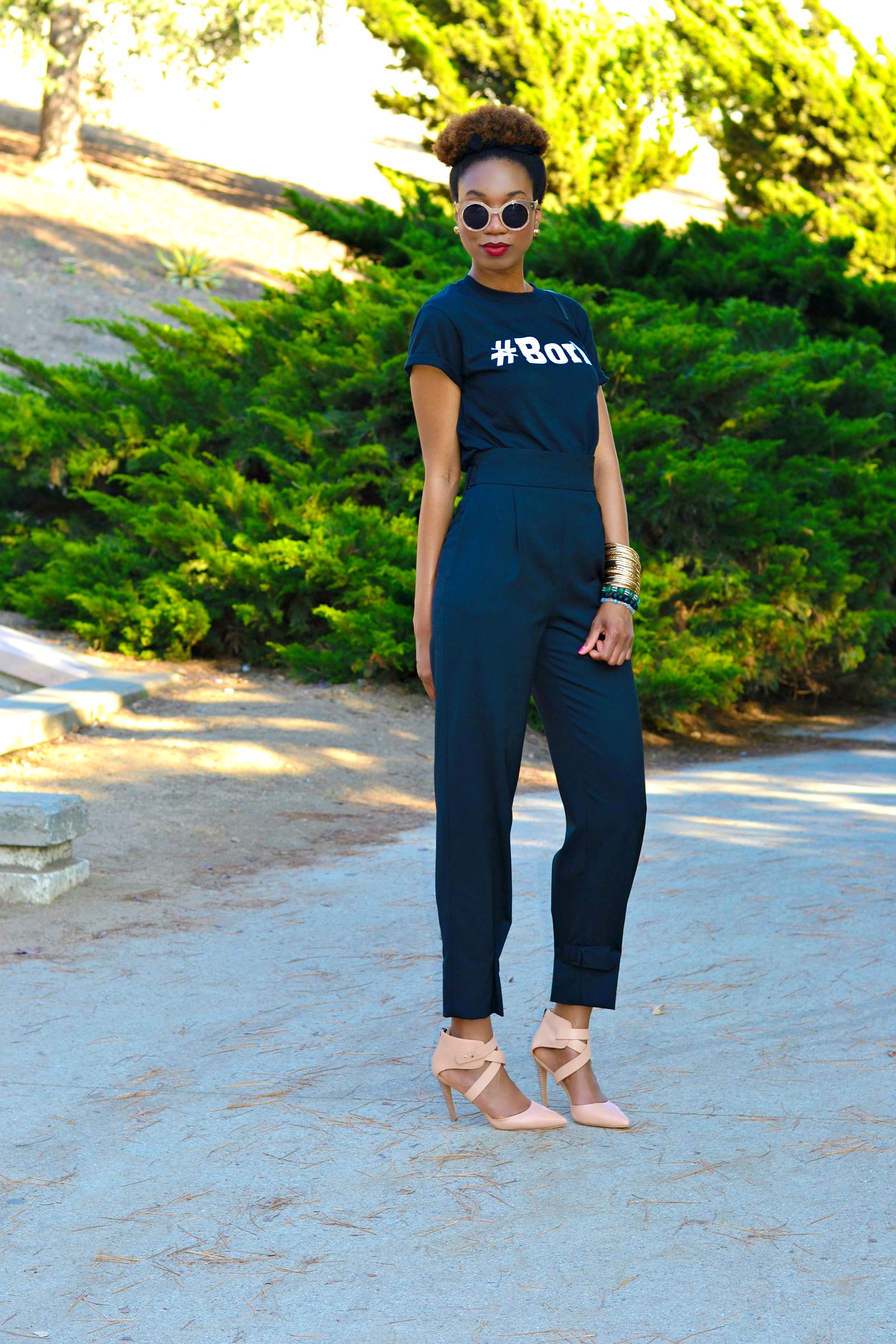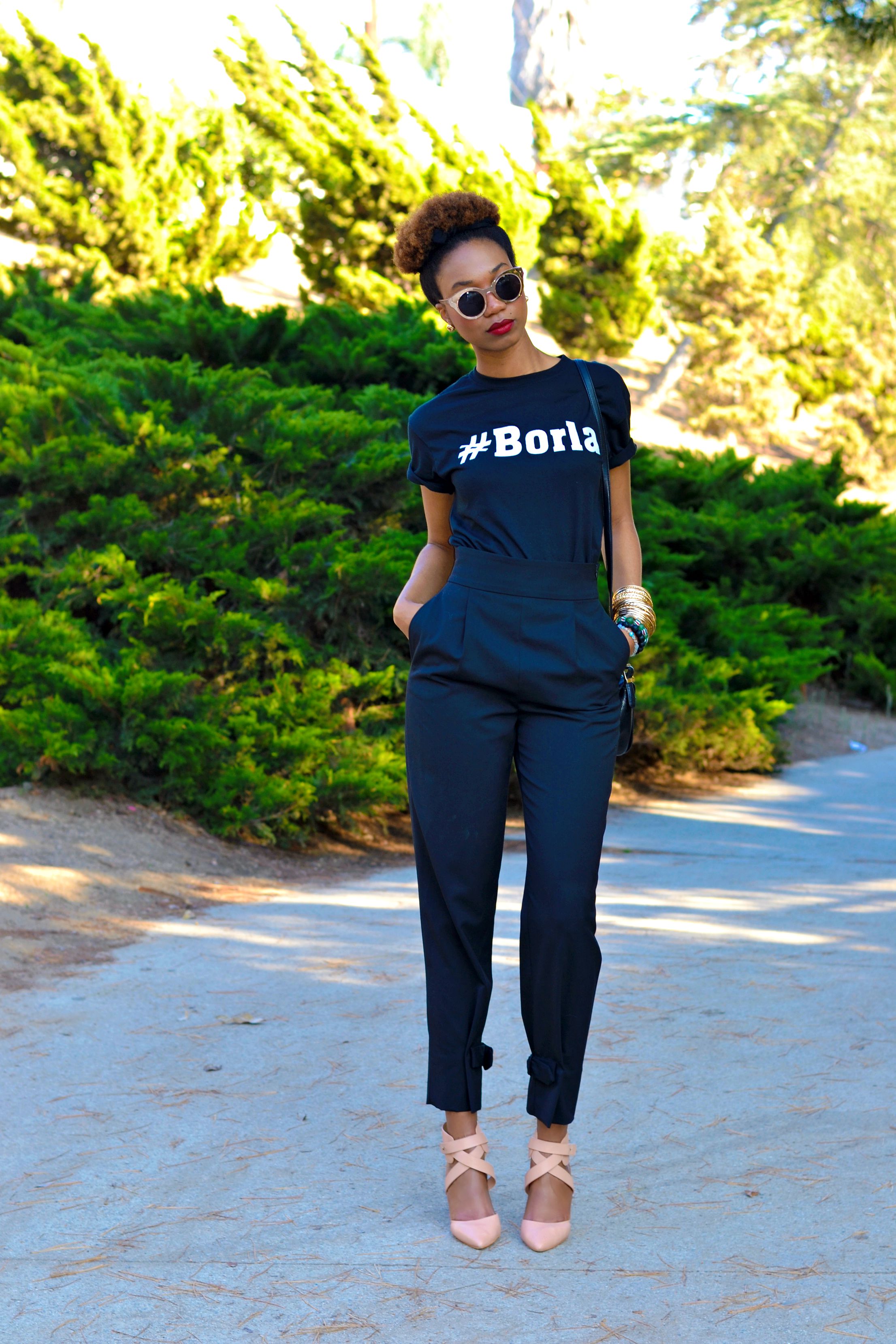 BORLA t-shirt, ZARA high waist pants, JOE’S pete pointy toe pump (as seen here), FOREVER 21 sunglasses (here), MCM vintage crossbody.