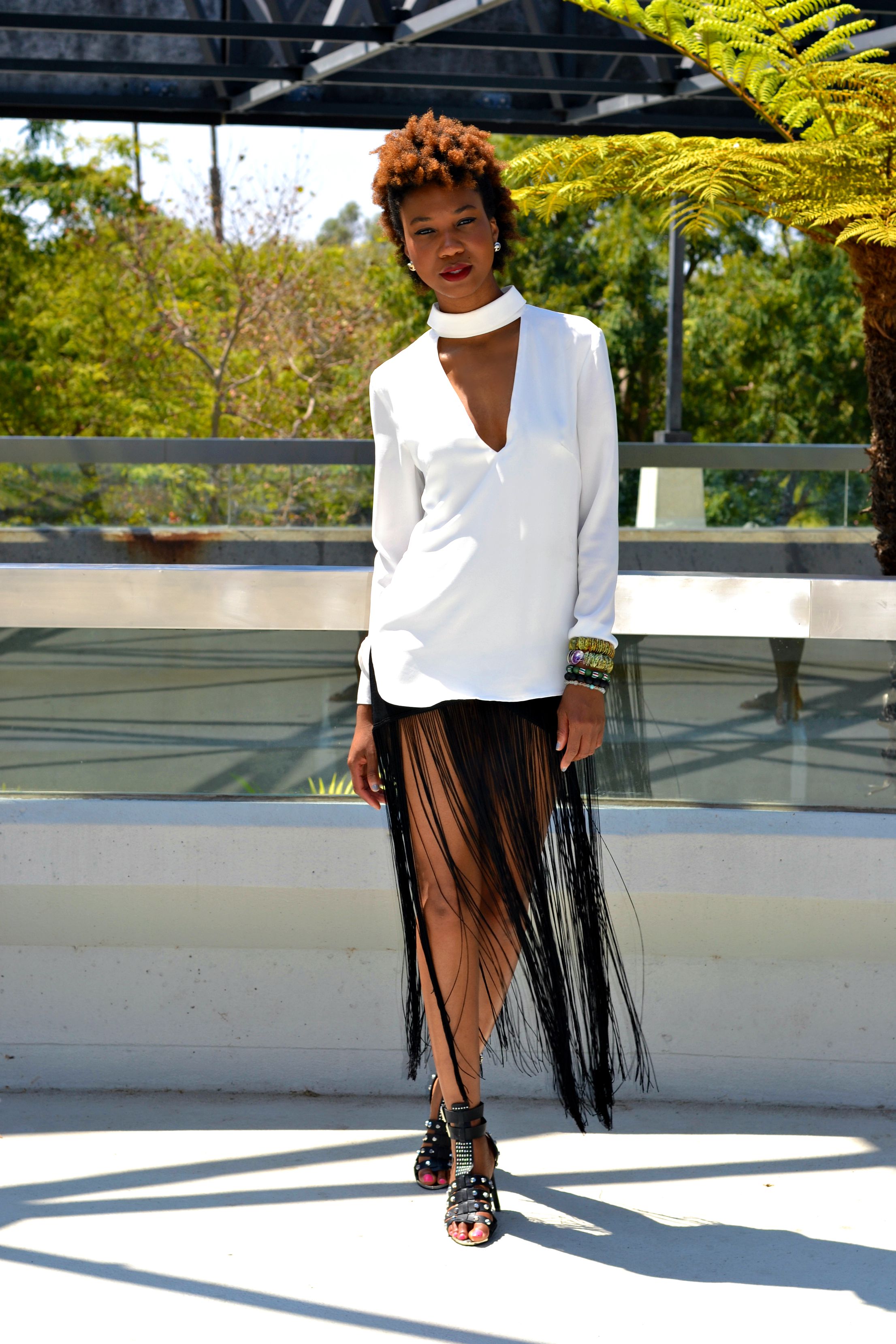 I’m wearing the coolest outfit that was purchased at the Nastygal Melrose. Each piece was draped on a hanger on opposite sides of the boutique, but you can count on me to always put the puzzle together. The cameo collective top for the chic and softer approach, and the asymmetric fringe skirt for the grunge. Complete the look with a mohawk inspired hairstyle and studded gladiator heels, and what do you have? Punk meets city girl.