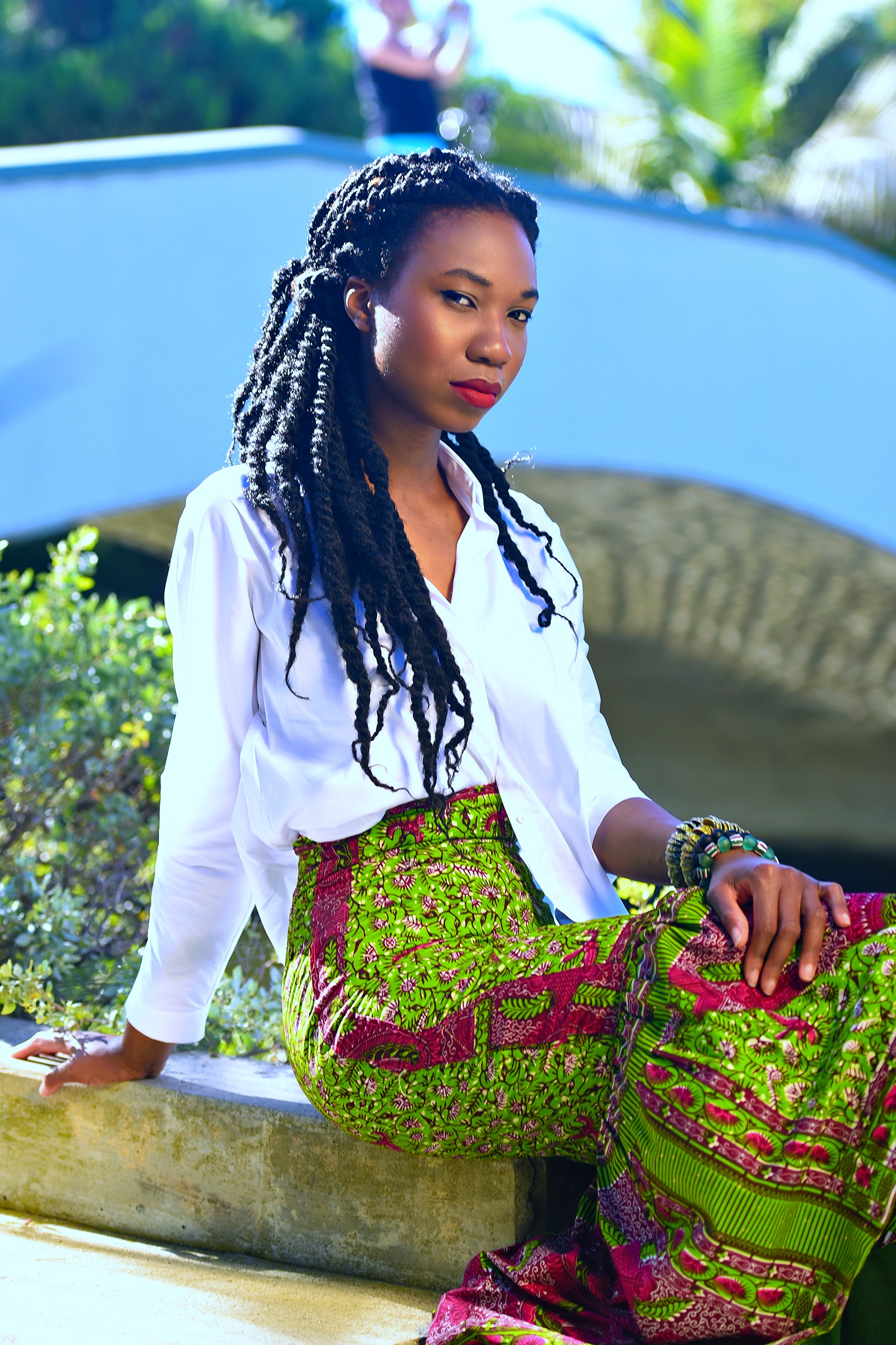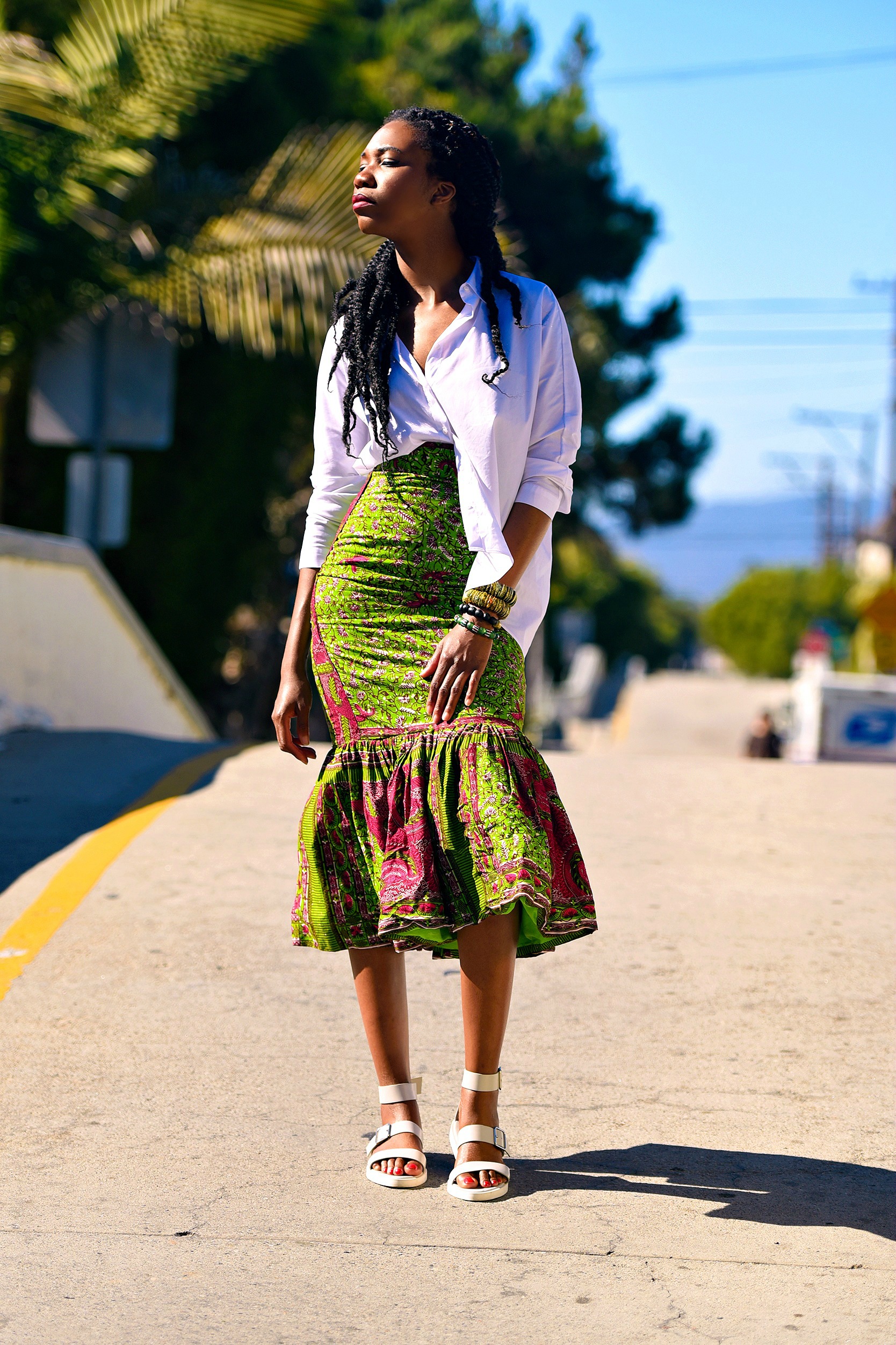 I usually wear a lot of color and printed outfits, but lately I have been in the mood for balancing my loud pieces with plain tops or bottoms. Take this ankara pencil skirt for instance, I love the green and aubergine color combination, and the flounce bottom just makes you want to do a double-take. To keep the look simple, I paired it with a plain button up and plain sandals. Add your pop of red lips, and you’re ready to conquer the day.